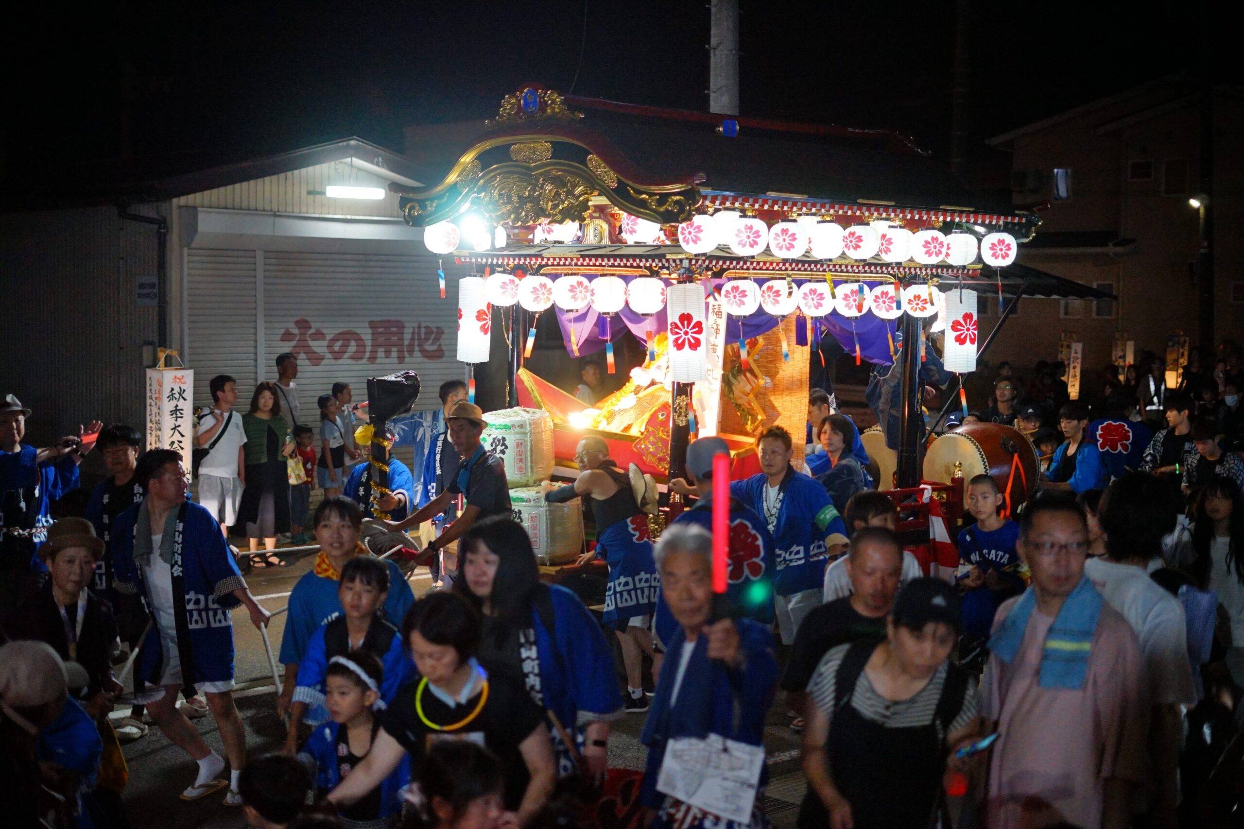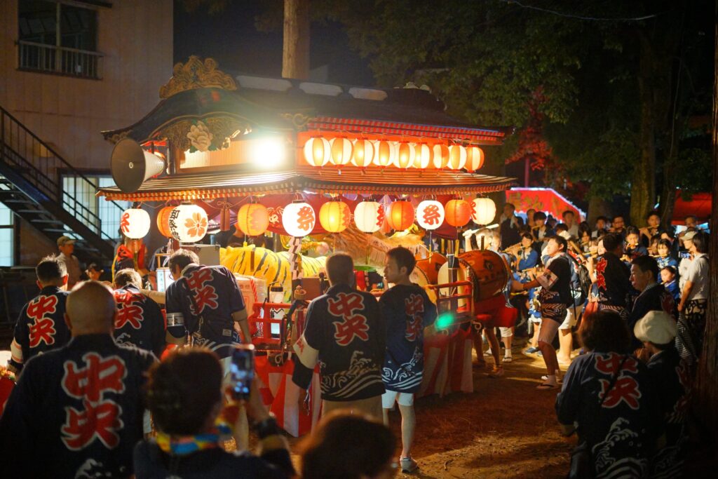 リズミカルな楽曲で活気あふれるシャギリの奉納。町内それぞれの曲があり、5台の屋台の装飾も趣向が異なり、さながらシャギリの競演のよう。上空では奉納の花火も打ち上げられていましたが、訪れた人たちは花火よりシャギリに夢中で、屋台に群がり、軽やかな音色に耳を傾けていました。5つの町内が順番に奉納した後、子どもたちや若翔会、また有志による演芸奉納もあり、屋台は21時過ぎにそれぞれの町内に向けて出発。大祭である翌日はまた町内を巡り、午後に再び白山神社でシャギリなどの奉納を行うというハードスケジュールをこなします。