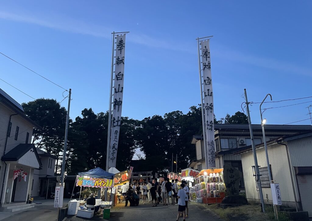 2005年に長岡市と合併し、20年が経過した越路。JR長岡駅から西南方向に位置し、車で約20分、電車なら信越本線に乗り、3つ目が越路支所の最寄りの来迎寺駅です。そこから徒歩10分足らずの住宅街に佇む来迎寺白山神社は、長らく地元の人々に親しまれ、生活の風景となってきた神社。8月の「白山神社秋季大祭」には地区内外からたくさんの人が集まり、熱気あふれるダイナミックな風景が見られます。祭りは2日にわたり開催されますが、その初日、宵宮(よいみや)祭に出かけました。