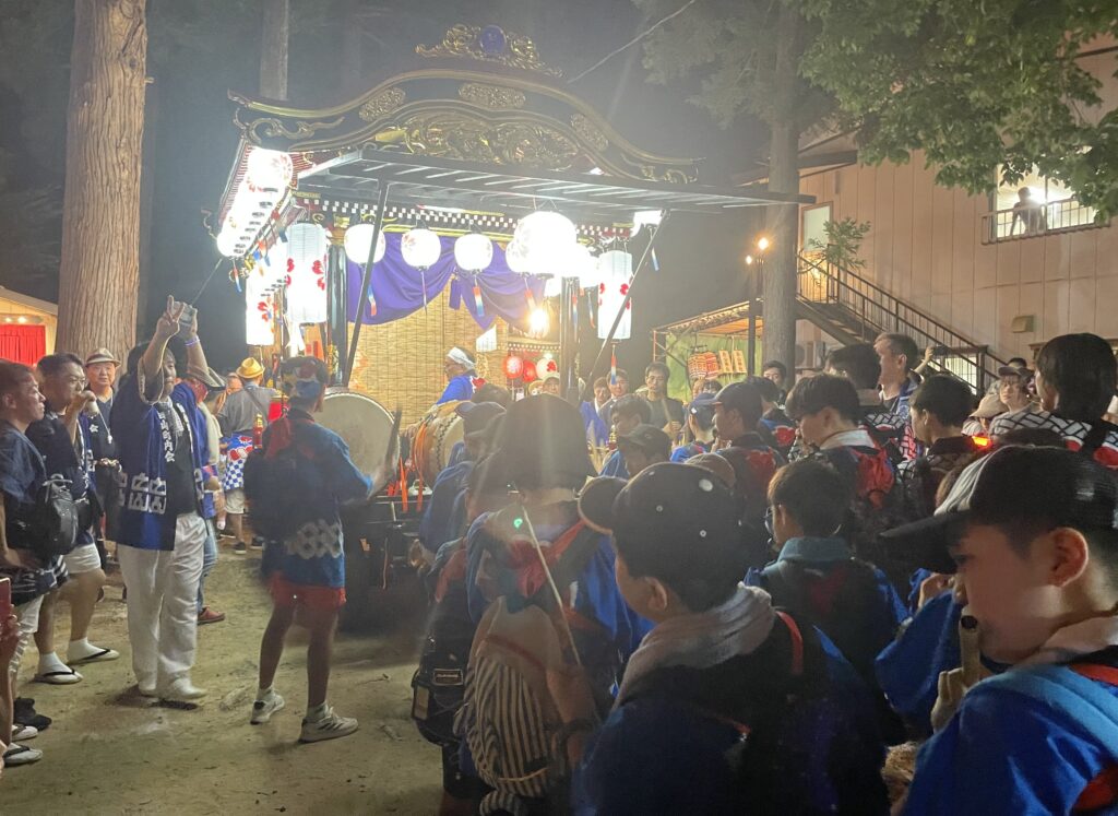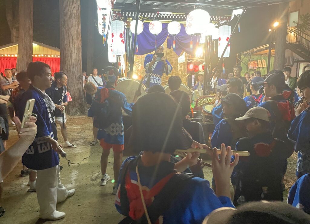 「うちの町内は、夏休み前に境内に仮設の⼩屋をつくって、そこに⼩学⽣が25⼈くらい。夏休みになると毎⽇、神社に集まって練習します。僕たちのときは30 ⼈から40 ⼈くらいいて、師匠から教わりましたが、それをいま僕らが教えているわけです。うちの町内は⼦どもたちに5 曲のシャギリを覚えてもらうのですが、ちゃんと吹けるかどうか、5年⽣になるとテストをして、笛がうまい⼦が太⿎を叩くことになっています。練習はけっこうハードで、⼦どもたち、すごく忙しいですよ(笑)。屋台の曳き回し時のシャギリはもちろんですが、神社で奉納をするシャギリは各屋台5分間なので、うちの町内らしい曲を⼊れて構成を考えます。実は、子どもたちで行うシャギリ奉納はうちの屋台だけで、ほかの屋台は年代関わらず総出で奉納しています。練習してきた分大勢の方に見てもらい、ほかの屋台からも一目置いてもらいたいとも思いますし、子どもたちも思い出に残ると思います。ただ、子供会の子たちの3年のための晴れ舞台というより、若翔会にあたる中高生もそうですが、町内の若手としてシャギリに携わる期間も長いので、町内としてどのような奉納の形がよいのかを模索していきたいです」