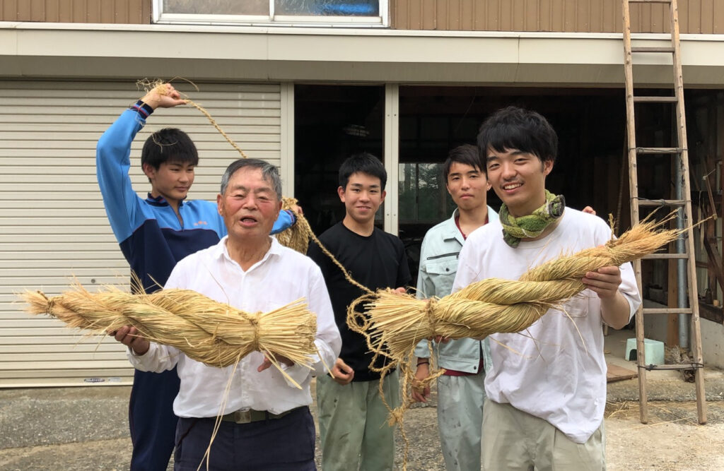 若翔会では、練習の成果を披露する秋季⼤祭に向け、楽器・演芸の練習を重ねるほか、神社のしめ縄も藁の準備から先輩に習って、神社委員の人たちと祭り前に作り、祭礼当日も朝早くから神社の飾りつけなどを行います。
