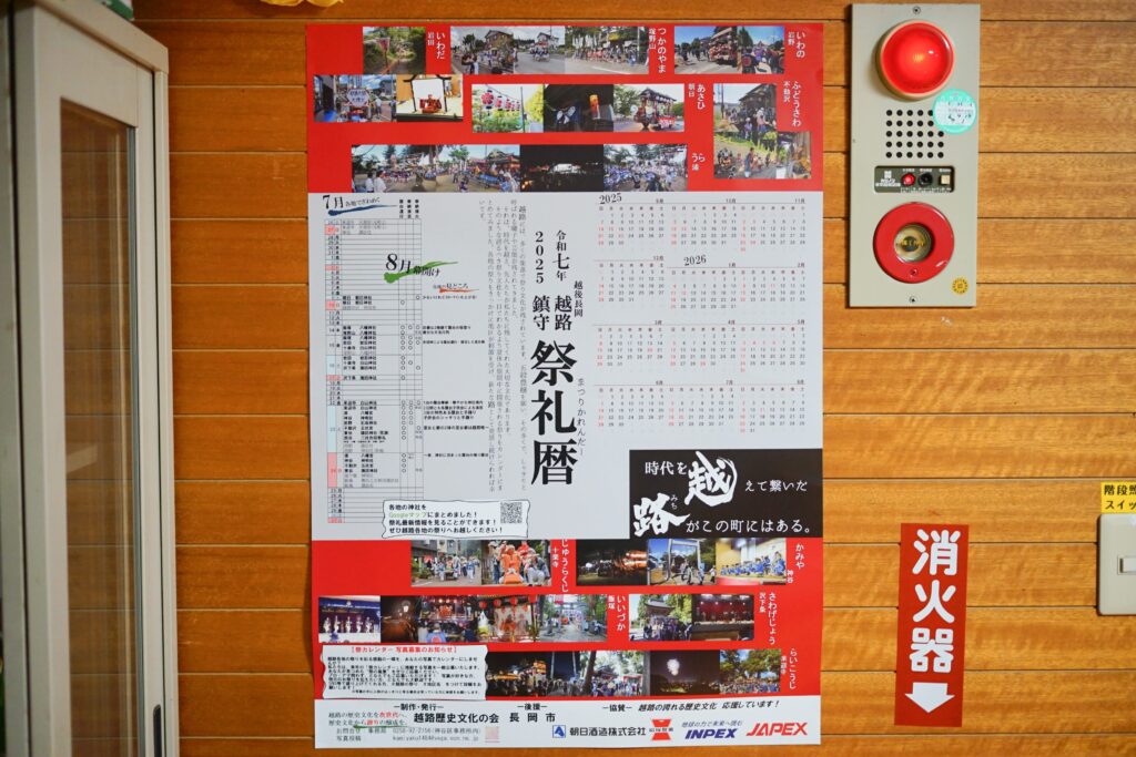 「祭りの朝6時に花⽕が上がると、このカレンダーを⾒て『今⽇はここね』とか、『来週はあそこの祭りだな』とかね。シャギリの練習が休みのときは若翔会の⼦どもたちを連れて、ほかの地区の祭りを⾒に⾏きます。そこで、その地区の友達なんかに会ったりして一緒に祭りを楽しんでいたり。やはり、越路のコミュニティの共通言語は祭りなんだなと感じる場面を実感します」
