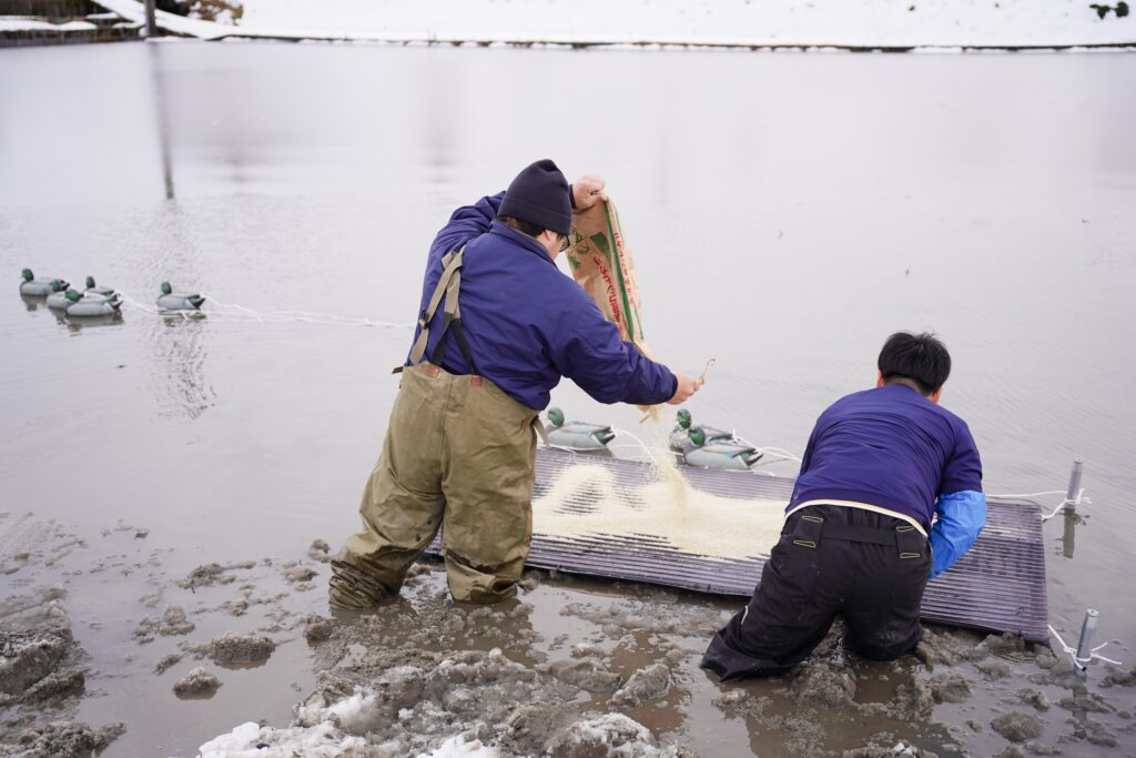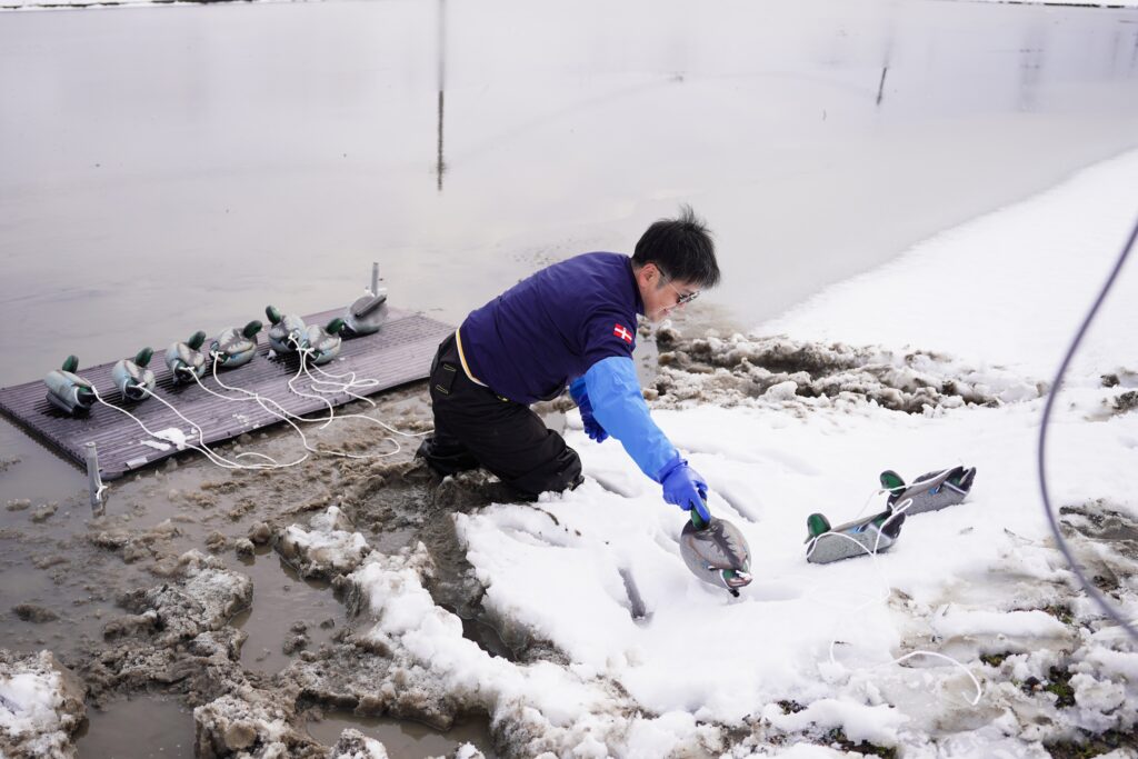 そこでNESTが現在取り組んでいるのが、おとり場を作って加害個体を一網打尽にするという検証実験です。 まずれんこんを掘り終えた田んぼに餌となる米をまき、カモのデコイ(模型)を設置し、スピーカーからカモの鳴き声を流し、「ここは安心な餌場だよ」と周囲のカモを誘導します。 ここが餌場だとカモが認識し数が集まったタイミングで、遠隔操作により網を放って一斉に捕獲する作戦です。果たして、その首尾は?