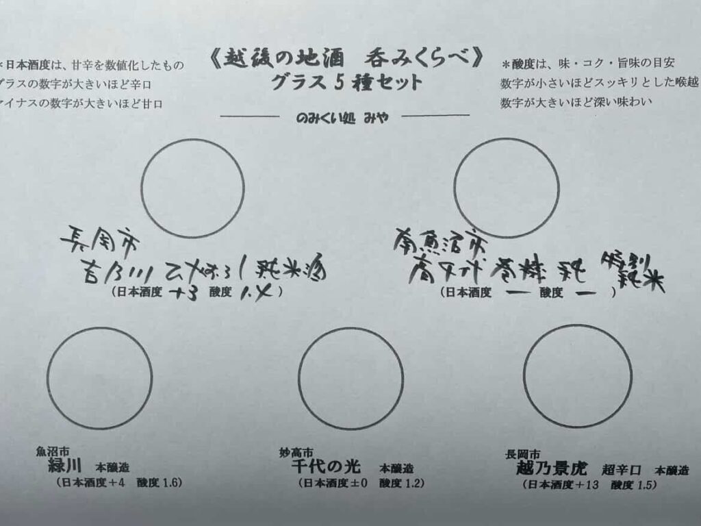 さらに、「みや」は日本酒の品揃えも本当に素晴らしいので日本酒好きなら訪れて損はなし。地元新潟の今が旬なお酒が多数セレクトされていて、そのラインナップにはうなるばかりです。日本酒ファンなら何を頼もうか迷うこと必至ですが、そんなときはぜひ女将に相談を。また、マスターのおすすめの日本酒を組み合わせた「越後の地酒 呑みくらべ」のセットもあり、少しずついろいろ飲んでみたい、といった希望も叶えてもらえます。